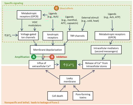 Biochemical signaling pathways that result in increased intracellular calcium concentration ([Ca2+]i). Different cell processes can lead to the influx of extracellular Ca2+ or the release of Ca2+ from the intracellular stores, both leading to increased [Ca2+]i. When assessing the effects of venom component toxins by constellation pharmacology using high extracellular potassium [K+] pulses (e.g., 25 mM KCl) as a depolarizing stimulus, three different effects could be observed according to the interaction of the venom components to one or more of the mechanistic pathways depicted here: amplification (phenotype A), which augments or prolongs subsequent membrane depolarization duration (e.g., potential mechanisms include blocking voltage-gated potassium channels or delayed inactivation of sodium channels); inhibition (phenotype B), which decreases or shortens the membrane depolarization duration (e.g., potential mechanisms include blocking voltage-gated sodium or calcium channels or activation of hyperpolarizing ion channels including GABA or glycine receptors); and direct effects (phenotype C) on voltage-gated ion channels and ligand-gated ion channels, including G-protein coupled receptors (GPCRs), causing a depolarizing elevation of cytosolic calcium levels. Finally, as with other calcium imaging-based assays, calcium ionophores and cytolytic events involving the loss of cell membrane integrity can result in a transient increase in the intracellular Ca2+, which is most often irreversible and leads to cell death with leakage of the Fura-2.