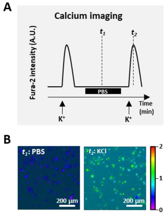 Output of the constellation pharmacology assay. (A) Representative tracing of two pulses of KCl with the application and incubation with phosphate-buffered saline (PBS) as a control. The application of extracellular KCl causes membrane depolarization, leading to an elevation of intracellular calcium and thus an increase in the Fura-2 signal. Note that the signal peak heights are reproducible and reversible; (B) Representative images of dorsal root ganglia (DRG) cells indicating Fura-2 intensity at the time of PBS incubation (t1) and during the application of KCl (t2) from A are shown.
