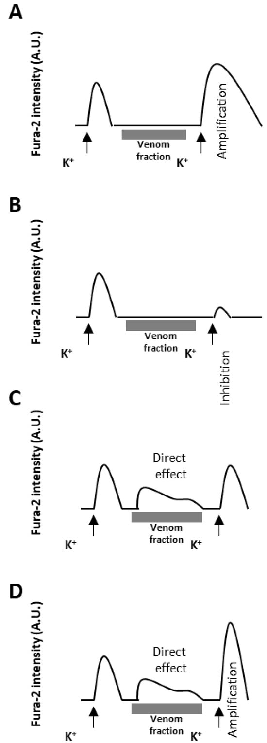 Representation of the different phenotypes evoked by venom fractions. X-axis is time in minutes and Y-axis represents the ratiometric emission of the Fura-2 excited at 340 nm and 380 nm. (A) Phenotype A: amplification of the KCl-induced Fura-2 signal. This phenotype could be elicited by voltage-gated potassium channel (VGKC) inhibitors, blockers of the voltage-gated sodium channel (VGSC) inhibition, or modulation of ligand-gated receptors; (B) phenotype B: inhibition of the KCl-induced Fura-2 signal. VGSC inhibitors or modulators of ligand-gated receptors are examples that could lead to this phenotype; (C) phenotype C: direct effect consisting of a spontaneous (independent from the depolarization stimulus) increase in [Ca2+]i upon incubation with the venom fraction. VGSC activators or ligand-gated receptor modulators could directly induce an increase in the influx of Ca2+; (D) example of dual effects. Complex venom fractions or isolated compounds could elicit a combination of phenotypes (typically A and C, or B and C) on the same cell. Some VGKC blockers, such as the conotoxin κM-RIIIJ, for instance, could cause both a direct effect and amplification [21].