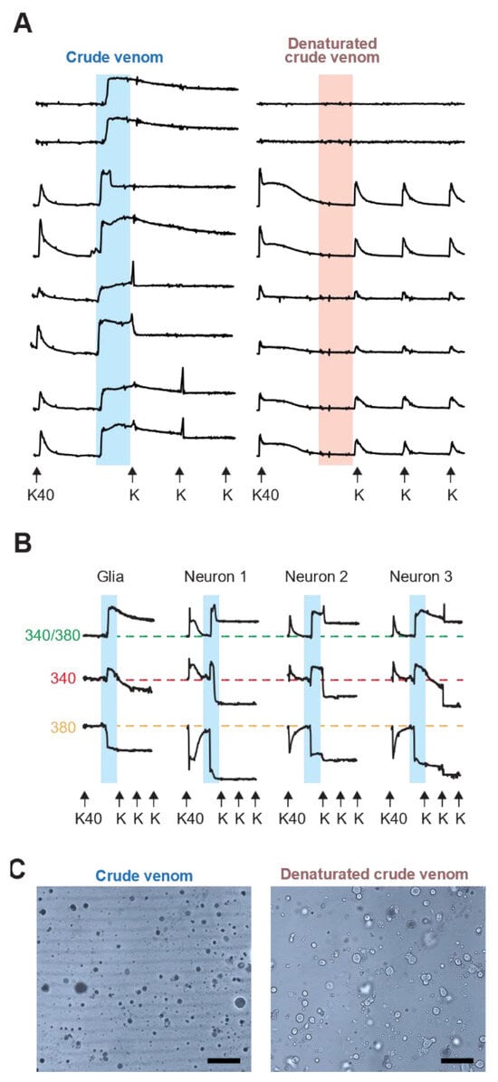 Porin activity of the Alatina alata crude venom using constellation pharmacology: (A) Representative traces of DRG cells exposed to crude venom for 3.5 min (blue and red boxes). The X-axis represents time. The Y-axis represents the ratiometric measurement of Fura-2 at 340 nm and 380 nm. K40 = 10 s pulse with 40 mM KCl; K = 10 s pulse of 25 mM KCl. Untreated crude venom (left) causes an increase in [Ca2+]i and sustained high ratiometric values. Crude venom denatured by heating at 100 °C for 10 min showed no effect; (B) comparison of the ratiometric signal (top row) with the deconvoluted signal of Fura-2 excited at 340 nm (middle row) and 380 nm (lower row); (C) bright field images of the DRG cells following 3.5 min treatment with crude or heat-denatured venom before and after the exposure with the crude venom. Scale bar = 100 μm.