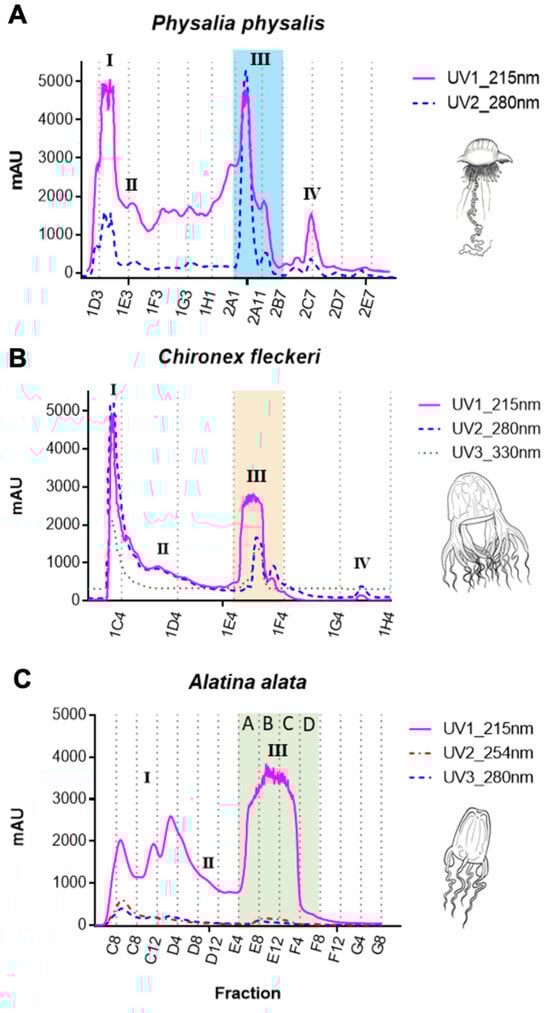 Size fractionation chromatograms of cnidarian venom preparations using size exclusion column high-performance liquid chromatography (SEC-HPLC). Major peaks are labeled: Peak I, molecular weight (MW) of ~250 kDa to 60 kDa comprising large proteins; Peak II MW ~50 kDa to 30 kDa comprising proteins including porins; Peak III MW ~15 kDa to 5 kDa comprising peptides and molecules investigated in this study; Peak IV MW ~3 kDa to 1 kDa. (A) P. physalis venom; (B) C. fleckeri venom; (C) A. alata venom. The fractions highlighted in Peak III were analyzed as subfractions (Peak III A–D) as well as pooled together.