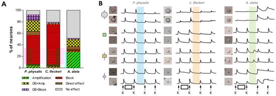 Using the constellation pharmacology approach, the relative activation or inhibition of neuronal and glial responses can be evaluated for venom fractions, elucidating their cell specificity, the type of response elicited, as well as their potency. Robust activity in 92.1%, 79.3% and 51.4% of neurons was observed following the application of 1/10th dilutions of P. physalis, C. fleckeri, and 1/50th dilution of A. alata venom fractions, respectively (Figure 5). Diverse and cell-type specific activities were found. Amplification of the calcium signal (phenotype A) was most prominent in response to A. alata venom, whereas inhibitory activity (phenotype B) occurred in ~30% and ~50% of neurons in response to P. physalis and C. fleckeri venoms, respectively. Finally, direct effects (phenotype C) were more common in A. alata (~45%) and P. physalis (25%) venoms. The excitatory and inhibitory effects on the neurons suggest the presence of multiple components targeting various pathways (Figure 1) that lead to the downstream modulation of calcium signal. These results correlate with published transcriptomics data [6,67,68,69,70], demonstrating the highly divergent nature of medusozoan venom composition, including small molecular weight proteins/peptides and molecules. Further, the activities of the Peak III fractions from representatives of the divergent cubozoan class orders of Chirodropida and Carybdeida (i.e., C. fleckeri and A. alata) are strikingly different.