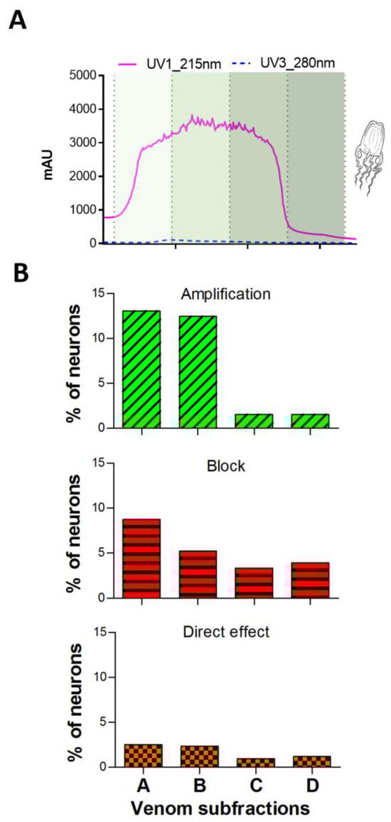 The constellation pharmacology platform was used to further analyze four pooled subfractions (A–D) comprising Peak III from A. alata venom (Figure 10A). Figure 10B shows a quantification of the different DRG cell responses to the subfractions. The different phenotypes are individually presented to follow specific activities. However, dual responses were also elicited by Peak III subfractions (see Supplementary Table S4). The application of both subfractions A or B elicited amplification of around 12–13% of the cells, whereas subfractions C and D showed amplification on less than 3% of the cells. The inhibitory effect ranged between ~4 and 8%, with no significant difference between the subfractions. Similarly, direct effects were homogenous in their distribution across the subfractions, with the effects occurring in less than 3% of the neurons. This suggests that the venom component(s) that causes the characteristic phenotype A response of the A. alata venom fraction (amplification of the KCl-driven signal) is principally found in subfractions A and B (the first half of Peak III).