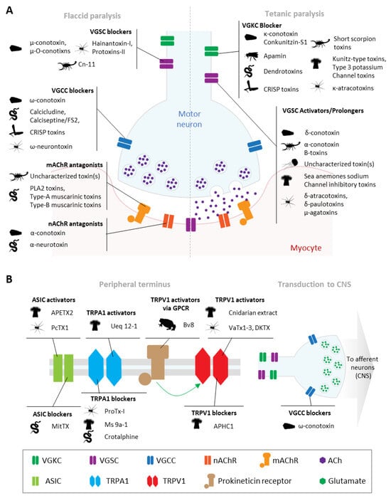 Venom-derived toxins in paralysis and pain: (A) Motor neuron–muscle synapse and toxin targets. Flaccid paralysis (left): the block of voltage-gated sodium channels (VGSC) inhibits the transmission of the electric signal to the neuronal terminus; the block of the voltage-gated calcium channels (VGCC) prevents the fusion of the synaptic vesicles for the release of the neurotransmitter acetylcholine (ACh). The block of the muscarinic (mAChR) and nicotinic (nAChR) acetylcholine receptors in the postsynaptic membrane inhibits the transduction of the signal into the myocyte. Tetanic paralysis: the block of voltage-gated potassium channels (VGKC) and the activation or activity prolongation of the VGSC result in more neurotransmitter release and overstimulation of the muscle. Modified from Trim and Trim 2013 [75]; (B) scheme of the pain-related receptors and the pain-signaling transmission to the central nervous system (CNS). Activation of the pain transducer receptors acid-sensing ion channel (ASIC) and transient receptor potential channel ankyrin 1 (TRPA1) and vanilloid 1 (TRPV1) lead to the activation of nociceptive neurons. The inhibition of either of these receptors has been related to analgesia. Additionally, the block of the VGCC at the nociceptor terminal abolishes the signal transduction to the CNS. Modified from Bohlen 2012 [76].