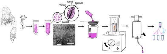 More specifically, various approaches aimed at recovering venom from tentacles have been published [1,53,54,55,56,57,58,63]. Most recovery methods use PBS, distilled water, or seawater to wash tentacles, followed by homogenization of the tentacles or centrifugation of recovered cnidae after incubation for hours to days in cold distilled water or seawater solution. The latter is termed “autolysis”, a process in which the tentacle begins to decompose and the mesoglea and tentacular muscle tissues dissociate. A certain number of cnidae spontaneously discharge during this “autolysis” step. Recovered cnidae are sometimes lyophilized or stored as frozen pellets, then ruptured using techniques such as grinding with siliconized glass mortar and pestle, glass-bead mill shaking, sonication, or exposure to freeze–thaw cycles with liquid nitrogen. The approaches using glass tissue homogenization [54] and sonication [53,55,56] result in less recovery of high molecular weight proteins and also contain tentacular cell debris, extracellular matrix components, and collagenous structural proteins of cnidae [1].