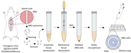 DRG dissection and dissociation protocol. Lumbar DRGs (L1–L6) were removed from the mice and transferred to a petri dish where the nerves were trimmed for cleaning. Individual DRGs were excised to expose the cells. Enzymatic tissue dissociation was performed using a trypsin solution for 20 min at 37 °C. DRGs were then mechanically dissociated by pipetting using Pasteur pipettes with decreasing diameter tips and sieved through a 45-µm cell strainer. Cell suspension was centrifuged and pelleted cells were resuspended in 100 μL of the culture medium. Aliquots of the resuspended solution were plated in 24-well plates within a silicone ring and incubated overnight in a cell culture chamber at 37 °C.