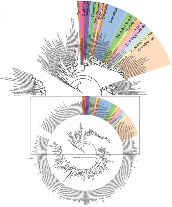 - Letunic, I.; Bork, P. Interactive Tree Of Life (ITOL) v5: An Online Tool for Phylogenetic Tree Display and Annotation. Nucleic Acid. Res. 2021, 49, W293–W296. [Google Scholar] [CrossRef] [PubMed]
