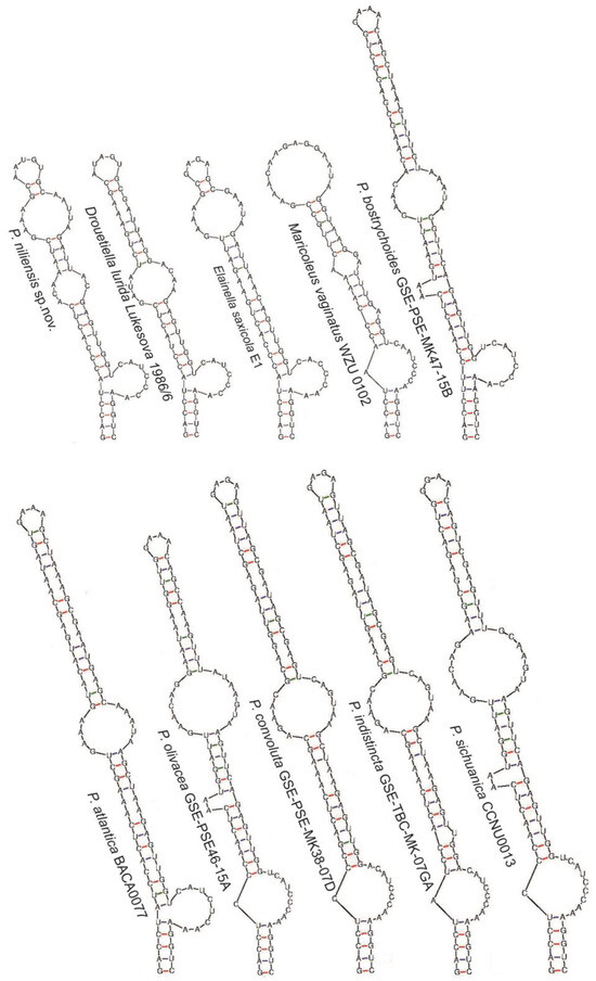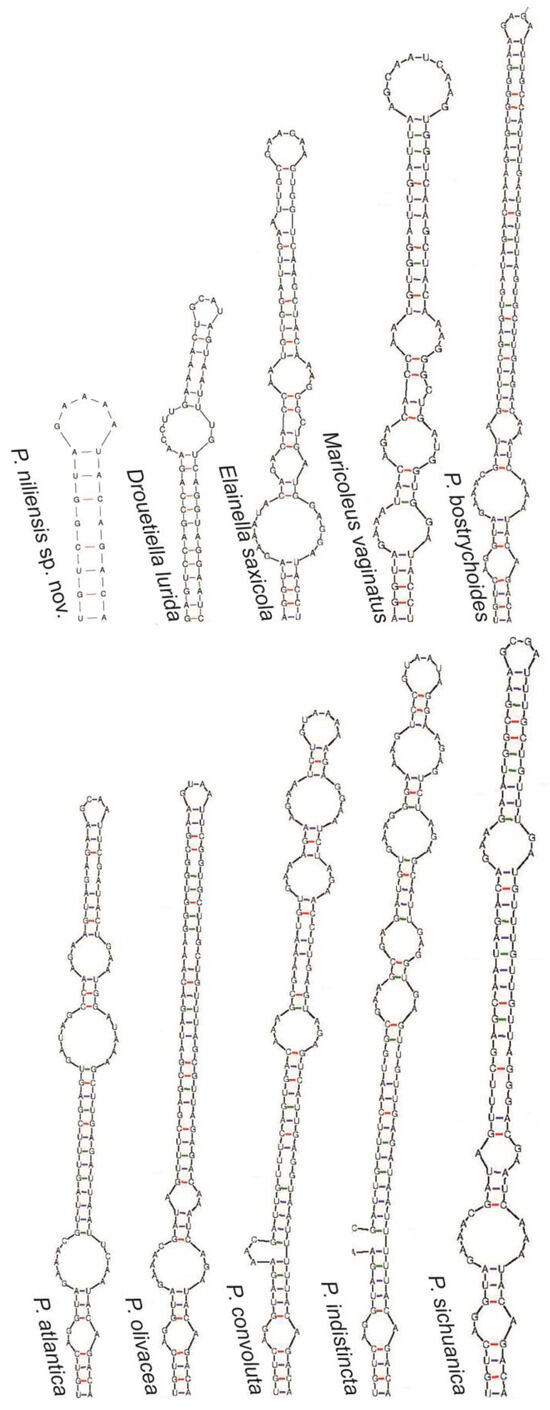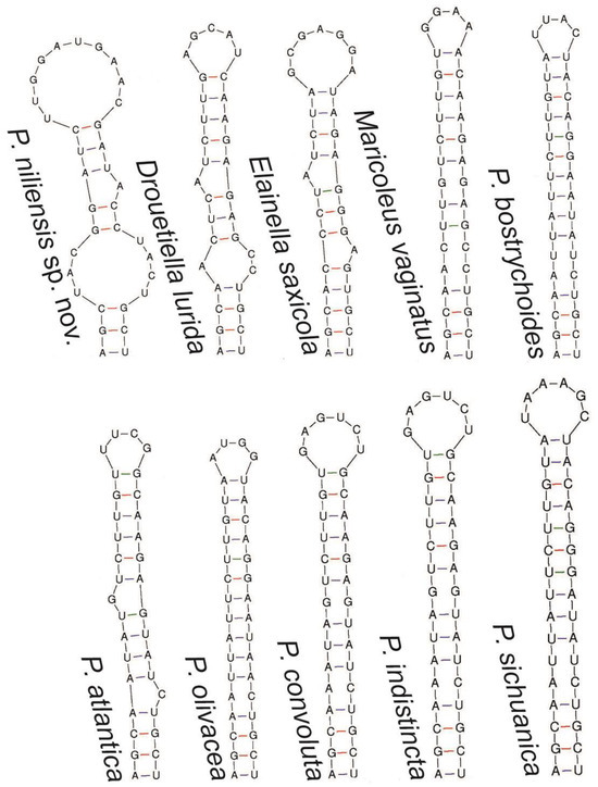 The 16S-23S ITS secondary structure analysis aligned with the previous analyses, indicating close relationship among all these genera (Figure 4, Figure 5, Figure 6 and Figure 7). All of them presented the sequence 5′-CAUCCCA-3′ in the basal lateral bulge of the D1-D1′ helix, with the only exception of P. altantica, which showed a single substitution resulting in the sequence 5′-CAUCUCA-3′ (Figure 4). No diagnostic characters in the secondary structures were found to separate these genera. In contrary, the sequence 5′-CAUCCCA-3′ at the lateral bulge can be considered a constant character for them. As for all the compared genera, the D1-D1′ helix of P. niliensis sp. nov. also featured the sequence 5′-CAUCCCA-3′ at the lateral bulge. However, the remaining regions of this helix, as well as the V2, Box B, and V3 helices, differed from the others in sequence, length, and structure.