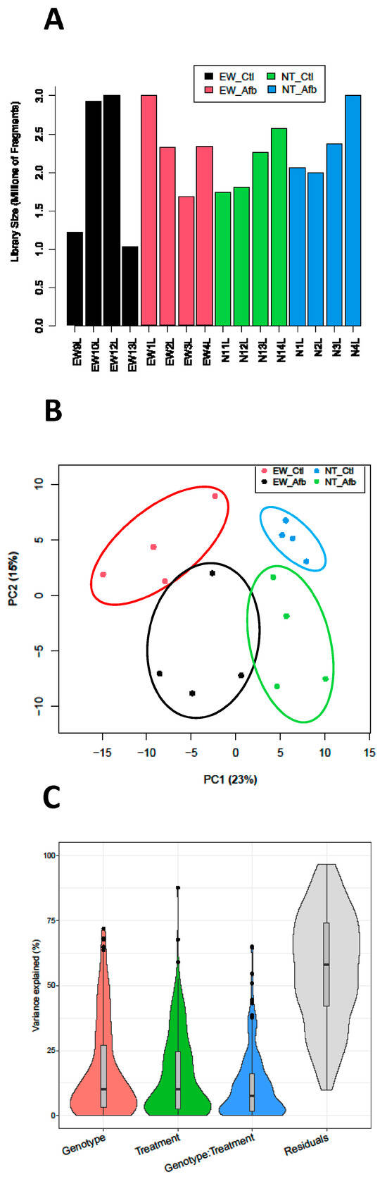 (A). Distribution of sequencing reads (Millions of fragments) in sequencing libraries of treatment groups (Control and AFB1). (B). Principal component analysis (PCA) plots of normalized read counts. Sample-to-sample distances (within- and between-treatments) are illustrated for each treatment sample on the first two principal components and plotted according to treatment. (C). Distribution of sample variance by treatment factor: Genotype (Line, Eastern Wild (EW) and Nicholas (NT) turkeys), AFB1 treatment, interaction, and residual.