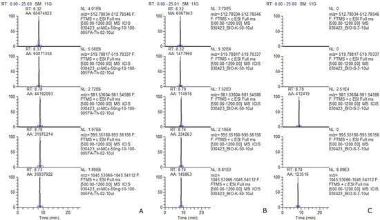 Extracted ion chromatogram of high resolution (mass accuracy within 5 ppm) for MC congeners detected in phytoplankton samples of Lake Onego: standard mix solution, concentration 50 ng mL−1 (A), sample K_50 (B), sample S_3 (C) (from top to bottom): m/z 512.78235 ([M+2H]2+ [D-Asp3]MC-RR); m/z 519.79077 ([M+2H]2+ MC-RR); m/z 981.54095 ([M+H]+ [D-Asp3]MC-LR); m/z 995.55658 ([M+H]+ MC-LR); m/z 1045.53589 ([M+H]+ MC-YR).