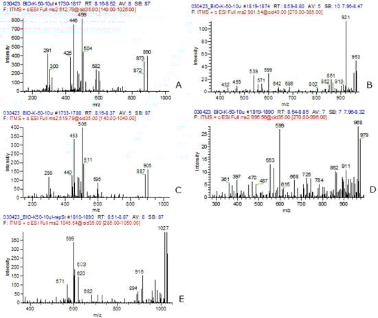 MS2 spectra of the MC congeners identified in the extract of sample K_50: [D-Asp3]MC-RR) (A); [D-Asp3]MC-LR) (B); MC-RR (C); MC-LR (D); MC-YR (E).