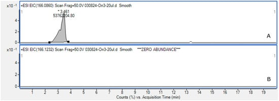 Since Dolichospermum spp. are known to produce anatoxin-a [], screening for the presence of anatoxin-a was performed using high-resolution mass spectrometry. Signals corresponding to anatoxin-a (m/z 166.12318) were not detected in any samples studied. An example of an isolated ion mass chromatogram is shown in Figure 3. However, an intense signal for the isobaric compound phenylalanine (m/z 166.0860) was present in the mass chromatogram for each phytoplankton sample examined (Figure 3A). This signal could be misidentified as anatoxin-a. The difference between these m/z values could only be distinguished using high-resolution mass spectrometry. In the case of low-resolution, fragment spectra should be examined for reliable identification [].