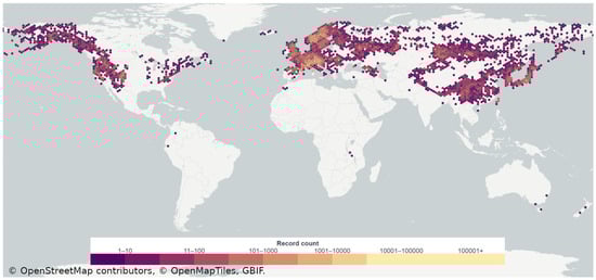 Global distribution of genus Aconitum. Plate Carrée map projection using georeferenced records of GBIF—the Global Biodiversity Information Facility (https://www.gbif.org/species/3033663, accessed on 2 February 2024)—map by OpenStreetMap® (Cambridge, UK) contributors (open data, licensed under the Open Data Commons Open Database License by the OpenStreetMap Foundation—the Creative Commons Attribution-ShareAlike 2.0 license: CC BY-SA 2.0), and open-source maps made for self-hosting by OpenMapTiles (open-source license: BSD 3-Clause License and CC-BY 4.0).