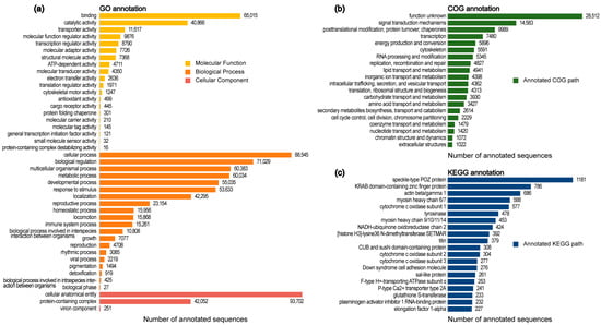 Transcriptomes for O. forcipiformis were constructed based on RNA sequencing data, and the de novo assemblies were generated using Trinity software-v0.23.1 (https://github.com/trinityrnaseq/trinityrnaseq/wiki accessed on 2018). To eliminate redundant transcripts, TGICL (TIGR gene indices clustering tools) was employed, resulting in 218.28 M clean reads. Details of the de novo assembly process are provided in Table S1. A total of 493,538 contigs (ORF) with an average length of 999.83 bp were identified using Trans Decoder software v5.7.0. (https://github.com/TransDecoder/TransDecoder accessed on 16 July 2023). Subsequently, a homology search against various public protein databases was conducted after removing Symbiodinium contamination from the clean contigs (ORF). Specifically, 92,487 (28.98%), 99,318 (31.12%) and 127,368 (39.91%) of the clean contigs showed matches in the Kyoto Encyclopedia of Genes and Genomes (KEGG) (https://www.genome.jp/kegg/ accessed on 1 January 2001), Gene Ontology (GO) (https://www.geneontology.org/ accessed on 8 September 2024) and Clusters of Orthologous Genes (COGs) (https://www.ncbi.nlm.nih.gov/research/cog/ accessed on 2021) databases, respectively, as presented in Table S1 and Figure 1. Furthermore, 5710 transcripts exhibited similarities to venom proteins in the Tox-Prot database of UniProtKB/Swiss-Prot (https://www.uniprot.org/help/Toxins accessed on 18 April 2023) among the identified transcripts.