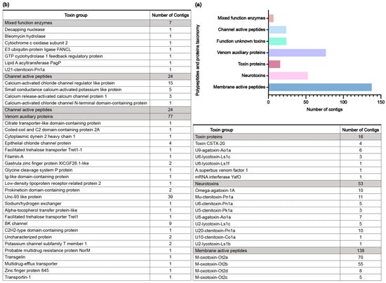 The transcripts were analyzed using BLASTp to search an exclusive database for toxins and venom proteins in the animal toxin annotation project (Tox-Prot) in order to find any probable venom-related polypeptides. Furthermore, the online program Signalp 6.0 [65] was utilized to confirm the presence of a signal peptide in each of the inferred venom-related polypeptides. Spider toxin pre-peptides were predicted by SpiderP ArachnoServer [66]. Adobe Photoshop 2020 and Adobe Illustrator 2020 were used for graphical processing.
