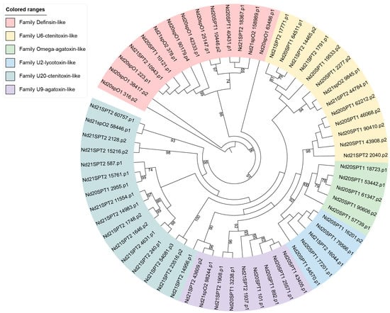 The AI-based result of the prediction showed that 16 have peptides antimicrobial properties (Table S5). Next, we found that a segment of a transcript (ID: Nd20SPT1: 79745.p1) showed 67.6% similarity to a venom-derived neuropeptide M-oxotoxin-Ot2b [45] (UniProt ID: P83248) obtained from the lynx spider Oxyopes takobius via a NCBI-BLASTP (https://blast.ncbi.nlm.nih.gov/Blast.cgi accessed on 9 October 2023) search.