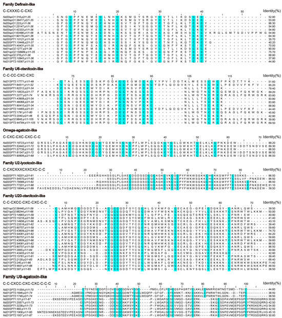 Multiple alignment analysis of the transcriptomic RNA-deduced amino acid sequences for putative toxins of O. forcipiformis. These sequences have been grouped into 6 families according to their sequence homology. Conserved cysteines are highlighted in blue.