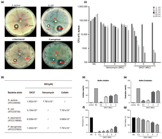 For antibacterial biofilm experiments, we checked the effectiveness of GK37 in inhibiting and eradicating biofilm formation of S. aureus at various concentrations (0.5, 1, 2 and 4 × MICs). The results show that GK37 significantly inhibited S. aureus biofilm in a concentration-dependent manner. At 2× MICs, GK37 reduced biofilm formation by approximately 50% in Figure 6d and removed 74% of the established one in Figure 6e. This great efficacy indicated that the antimicrobial mechanism of GK37 might involve targeting both biofilm and planktonic cells [50].