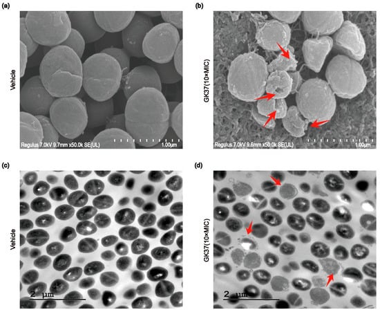The membrane morphology changes of S. aureus treated with GK37 (10× MICs) for 2 h determined by SEM and TEM. (a) The morphology of untreated S. aureus under SEM. (b) The morphology of S. aureus interacting with GK37 under SEM. Red arrows point to the distorted and shriveled bacterial membrane. (c) The morphology of untreated S. aureus under TEM. (d) The morphology of S. aureus interacting with GK37 under TEM. Red arrows point to the membrane lysis area.
