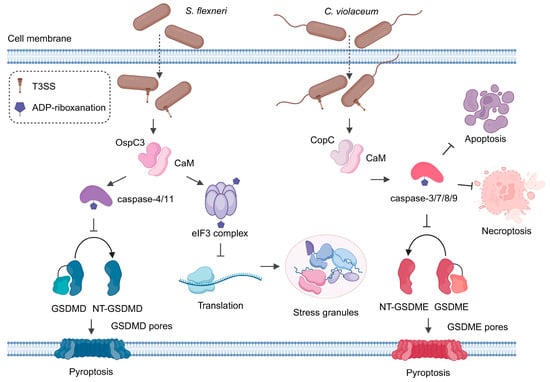 - Li, Z.; Liu, W.; Fu, J.; Cheng, S.; Xu, Y.; Wang, Z.; Liu, X.; Shi, X.; Liu, Y.; Qi, X.; et al. Shigella Evades Pyroptosis by Arginine ADP-Riboxanation of Caspase-11. Nature 2021, 599, 290–295. [Google Scholar] [CrossRef]
