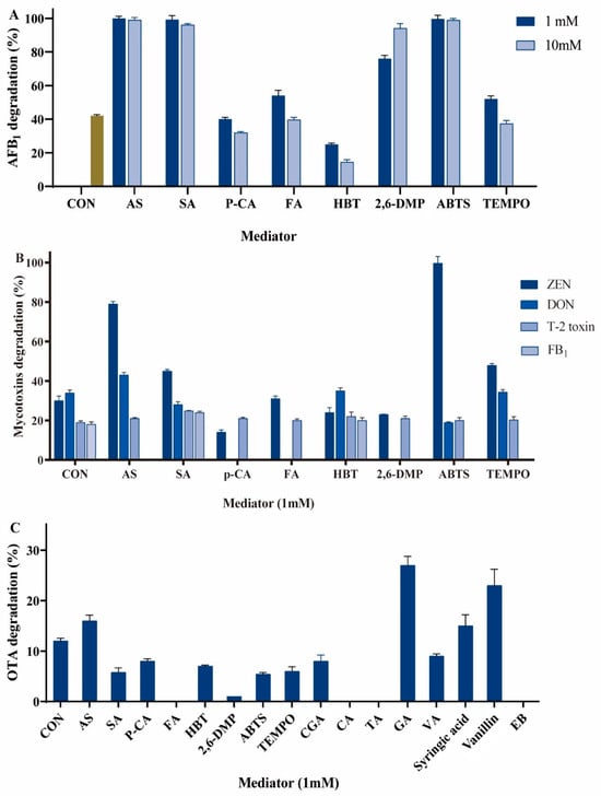 Our previous study showed that Lac-W degrades six mycotoxins with varied degradation rates, including AFB1 (88%), ZEN (60%), DON (34%), T-2 toxin (19%), FB1 (18%), and OTA (12%), after 24 h incubation without mediators [32]. When the reaction time was shortened to 1 h, the above six mycotoxins had almost no degradation. Given the mycotoxin degradation rates by Lac-W were not exceptionally high, different redox mediators were screened to assist in degrading mycotoxins in this study.