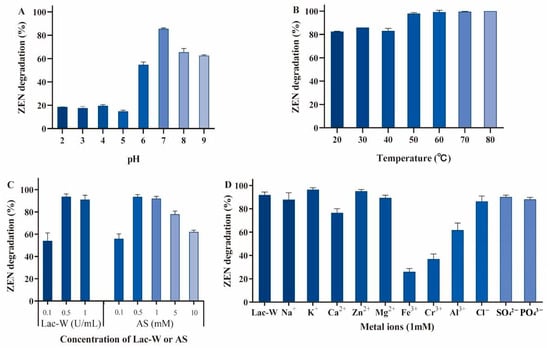 Effects of culture conditions on Lac-W-AS-mediated ZEN degradation. (A) Effect of pH on ZEN degradation. (B) Effect of temperature on ZEN degradation. (C) Effect of concentration of Lac-W and AS on ZEN degradation. (D) Effect of ions on ZEN degradation. The Lac-W was incubated with different ions at room temperature for 10 min, followed by ZEN. Reaction conditions: initial ZEN 1 µg/mL, culture conditions in static condition, pH 2.0–9.0, 20–80 °C, concentration of Lac-W or AS were 0.1–1 U/mL or 0.1–10 mM, and incubation time 1 h. The temperature, Lac-W/AS concentration, and metal ion assays were performed under optimal conditions derived from the pH, temperature, and Lac-W/AS reactions, respectively. Three independent replicates were performed for each assay. Each reaction was repeated three times.
