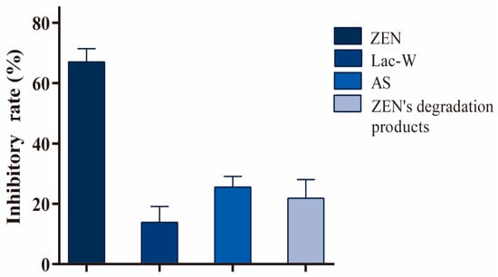 The inhibition rate of ZEN, Lac-W, AS, and ZEN’s degradation products against Vibrio fischeri. Each reaction was repeated six times.