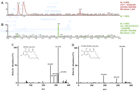 Mass spectra analysis of the ZEN degradation by Lac-W-AS. (A) Total ion chromatogram of ZEN (retention time of 5.16 min). (B) Total ion chromatogram of the ZEN degradation product (retention time of 3.62 min). (C) The mass spectra analysis of ZEN (C18H22O5; [M-H]− with m/z 317.2715). (D) The mass spectra analysis of the ZEN degradation product by Lac-W (C18H22O6; [M-H]− with m/z 333.1376). Mass spectrum parameters: ESI ion source, negative ion mode, and full scanning range 100–1500 m/z. The ion transfer tube temperature was set to 325 °C, and the vaporizer temperature was 350 °C. Orbitrap had a resolution of 120,000. The metabolite analysis software was Compound Discovery 3.0.
