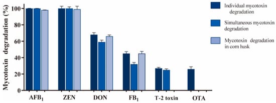 Mycotoxin cocontamination of agricultural commodities is a worldwide concern, owing to the serious health safety threat to livestock and humans and the substantial economic burden on animal husbandry and the food industry [1,2,3]. Multiple-mycotoxins cocontamination shows a comparatively high prevalence in cereal-based feedstuff and food [4]. Over a three-year period from 2018 to 2020, >75% of maize tested positive for multiple mycotoxin in different countries globally (Europe, Africa, Asia, and South America) [5]. Data from around 500,000 analyses from the European Food Safety Authority and an extensive global survey for multiple mycotoxin in cereals and nuts showed the occurrence of mycotoxins to be up to 60–80% [6]. Hundreds of types of mycotoxins with chemical heterogeneity have been identified [7]. However, not all of these mycotoxins are covered by legislation and guidelines issued in China, America, and the European Union. These jurisdictions focus on AFB1, ZEN, deoxynivalenol (DON), T-2 toxin, fumonisin B1 (FB1), and ochratoxin A (OTA) as these cause serious carcinogenic effects and organ damage, as well as their widespread prevalence [8,9]. Efficient mycotoxin detoxification strategies are therefore sought to secure global food supplies.