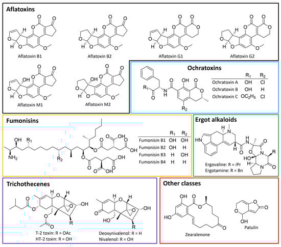 | DON | F. graminearum, F. culmorum | Immunotoxic, hematotoxic, neurotoxic | Grains, barley, wheat, corn | [63] |