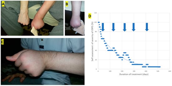 Photos were taken at the baseline visit: (A) Comparison of both hands; (B) livid skin color of the impaired left forearm; (C) edema and dystonia of the left forearm; (D) self-assessment of the severity of CRPS in % of the severity at the baseline visit (using a 21-point Lickert scale). The arrows indicate the application of injections 2 to 6.