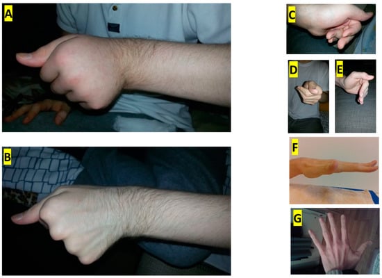 (A) Oedema and dystonia of the left hand and forearm before the 1st injection. (B) Improvement of oedema and dystonia of the left hand two weeks after 1st injection. Attempts to open the left hand voluntarily: (C) after the 1st injection, (D) after the 2nd injection, (E) after the 3rd injection, (F) after the 4th injection, and (G) after the 5th injection.