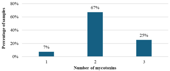 Percentage of samples of total mixed ration for dairy cows from the southeast region of Brazil containing one, two, or three mycotoxins.