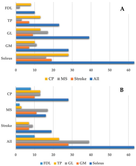 When stratified according to the etiology of spasticity, clonus was predominantly caused by the soleus, followed by the GL, then the TP and GM after stroke, with no contribution of the FDL. In patients with MS, the GL and soleus showed similar frequencies, with the GL being slightly more frequently involved, and GM overactivity was the third most common cause of clonus. In patients with CP, the soleus was the primary contributor, followed by equal involvement of the GL and TP, with the GM and FDL contributing less frequently (Table 3, Figure 1).