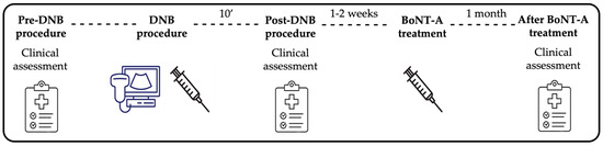 Patients underwent (a) clinical assessment before and (b) after the DNB procedure; (c) BoNT-A treatment of the calf muscles, based on DNB and 1–2 weeks later; and (d) clinical assessment one month after BoNT-A injection (Figure 2). Baseline data (i.e., before performing DNB) included gender, age, the underlying cause of spasticity, and clinical features of SEVF using the Tardieu grade and MAS for both knee-extended and knee-flexed positions. Data collected approximately 10′ after each DNB procedure included the specific motor nerve branches targeted, the dose of lidocaine, and the Tardieu grade for both knee-extended and knee-flexed positions. The Tardieu grade was also assessed after BoNT-A treatment.