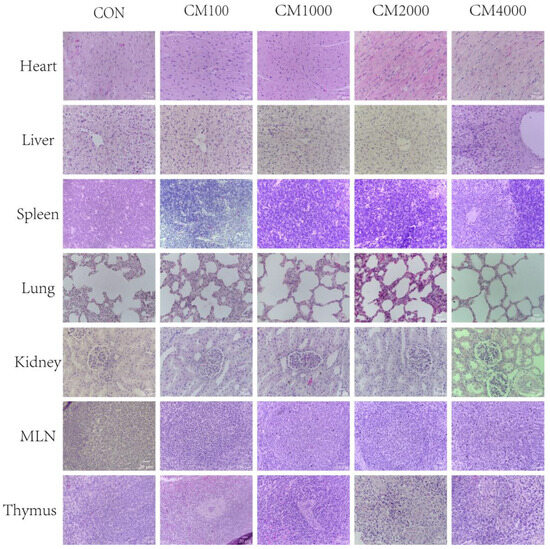 Effects of dietary CM supplementation on organ histopathology of heart, liver, kidney, spleen, thymus, mesenteric lymph nodes, and lungs in piglets (H&E; ×400). CON, basal diet fed; CM100, CM1000, CM2000, and CM4000, pigs were fed a basal diet supplemented with 100, 1000, 2000, or 4000 mg/kg CM; and MLN, mesenteric lymph nodes.