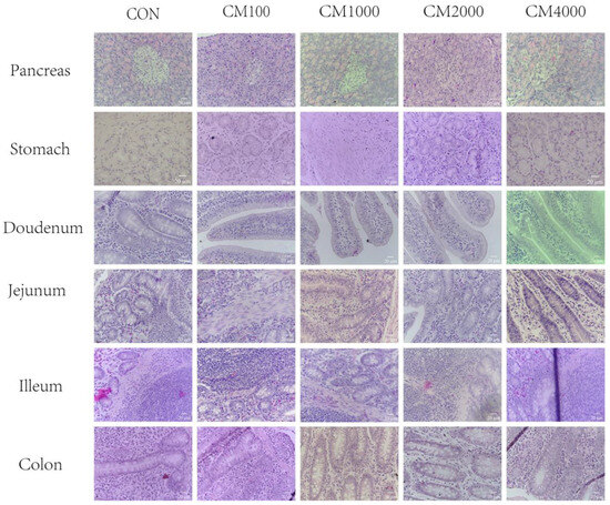 Effects of dietary CM supplementation on organ histopathology of pancreas, stomach, duodenum, ileum, jejunum, and colon in piglets (H&E; ×400). CON, basal diet fed; CM100, CM1000, CM2000, and CM4000, pigs were fed a basal diet supplemented with 100, 1000, 2000, or 4000 mg/kg CM.