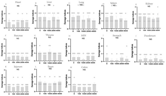 Effect of different CM supplementation levels on organ/tissue damage indices in pigs. (A–M) Damage degree of heart, liver, kidney, spleen, thymus, mesenteric lymph nodes, lungs, pancreas, stomach, duodenum, ileum, jejunum, and colon in pigs. The damage indices range from 0 to 3 (0, completely healthy; 1, mild injury; 2, moderate injury; and 3, severe injury). Each dot represents the organ damage score of an individual pig (n = 6). NS, not significant (p > 0.05).
