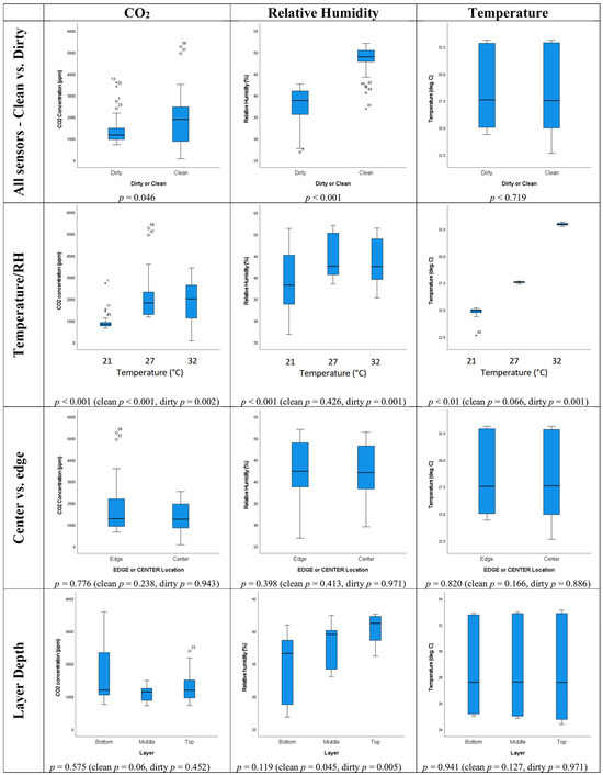 Environmental conditions in terms of average CO2 concentration, temperature and humidity within storage bins over study period. p values are for comparison tests using clean and dirty data together and p values in brackets are for clean and dirty data separately. Clean and dirty refer to very low or high concentrations of aflatoxin present in corn. * and hollow circles in the boxplots indicate values that are outliers (more than three standard deviations from the mean).