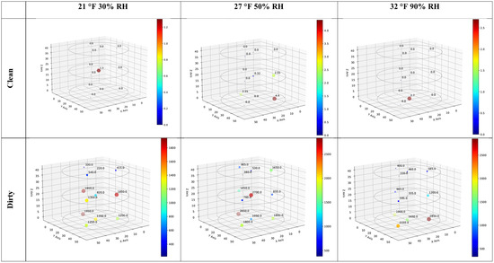 Figure 3 shows the spatial distribution of average aflatoxin levels (the average of two values) at sensor locations for clean and dirty corn after being stored at 21 °C, 30% RH; 27 °C, 50% RH; and 32 °C, 90% RH for two months. For all the clean corn, most values are zero, apart from some low values in the middle and bottom layers of the bin. For the dirty corn, values in the lower two layers tend to be >1000 ppb, apart from a few values for the middle layer in the 32 °C, 90% RH bin that are <1000 ppb. The values for the top layers of each bin are generally <600 ppb, apart from two values >900 ppb in the top layer of the 27 °C, 50% RH bin. Figure 3 shows two elevated values in central locations for the clean corn, one in the 21 °C, 30% RH bin’s middle layer and one in the 32 °C, 90% RH bin’s bottom layer. However, for the 27 °C, 50% RH sample, both of the non-zero values are at edge locations. For the dirty corn, there is a slight tendency toward lower values in the central locations for the 21 °C, 30% RH and 32 °C, 90% RH conditions, which agrees with previous findings [49] and the hypothesis that there is less mycotoxin build-up in central locations than edge locations because edge locations are more aerobic. However, the same pattern was not found for the 27 °C, 50% RH conditions.
