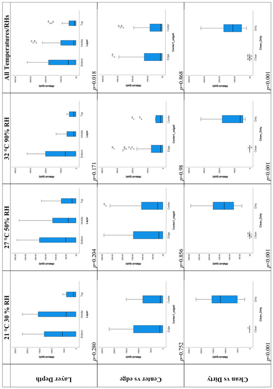 The top row of box plots in Figure 4 shows differences in the distribution of aflatoxin levels in the layers for each temperature/RH treatment and for all treatments considered together. For each treatment, the aflatoxin levels in the top layer are lowest. For the 27 °C, 50% RH and 32 °C, 90% RH treatments, the bottom layer has the highest aflatoxin levels. The box plots show the expected general trends given previous findings [49] that mycotoxin levels tend to be greatest near the base of a grain pile, probably due to increased liquid moisture collecting there under the influence of gravity, and this is a significant difference (p = 0.018) when the data for all temperature/RH treatments are considered together.