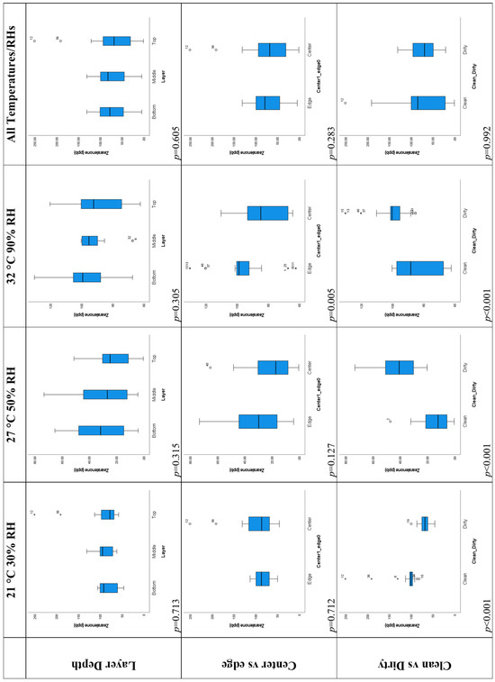 The top row of box plots in Figure 7 shows how zearalenone concentration varies with layer depth. For all temperature/RH treatments, there is no significant difference between the layers (p = 0.305–0.713). However, for the dirty corn and some temperature/RH treatments, the order of concentrations between layers shows the expected pattern suggested by previous research [49], with the bottom layer having the highest concentrations and the top layer having the lowest concentrations for the 27 °C, 50% RH treatment, the 32 °C, 90% RH treatment and all temperature/RH treatment data (Table 4). However, differences between layers were not significant (p = 0.487 and p = 0.833 for clean and dirty corn, respectively). As there is currently no FDA limit for zearalenone, it is not possible to determine based on the mean concentrations by layer (Table 4) if some grain waste could be avoided by treating the grain stored in different layers as different micro-batches. However, this is unlikely given that the differences between layers were not significant.