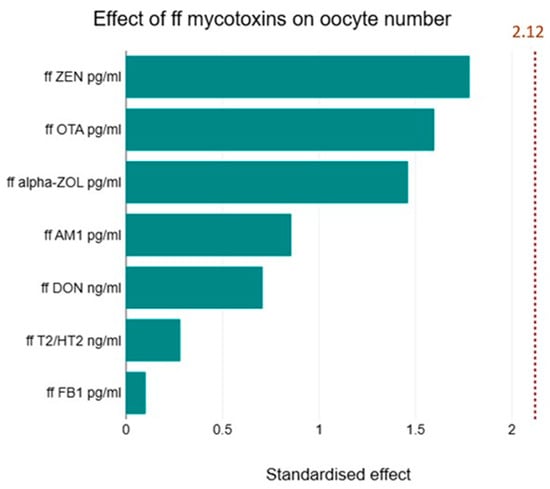 Effect of the level of follicular fluid mycotoxins on oocyte number. Pareto analysis was used to show the possible impact of mycotoxins on oocyte development. The diagram shows the differences that were examined between the impacts of mycotoxins. However, their impact did not reach the level of significance.
