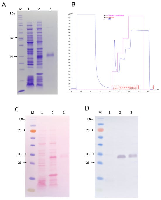 (A) 12% sodium dodecyl sulfate–polyacrylamide gel electrophoresis (SDS-PAGE) gel showing expression and purification of the recombinant JarC overexpressed in E. coli BL21 Star™ (DE3) at 37 °C. Protein was visualized on a 12.5% SDS/polyacrylamide gel under reducing conditions and stained with Coomassie blue R (Sigma-Aldrich, St. Louis, MO, USA). (B) Chromatogram of rJarC purification by Immobilized Metal Chelate Affinity Chromatography (IMAC). (C) For the analysis of rJarC expression by Western blot, proteins were separated by 12% SDS-PAGE, transferred onto nitrocellulose membrane, and stained with Ponceau red dye. (D) The nitrocellulose membrane was treated with an anti-His antibody for detection. For figures (A,C,D): The numbers on the left indicate the molecular mass markers (M). Lanes 1 and 2 show the extracts from BL21 Star™ (DE3) cells before and after induction with 1 mM isopropyl-β-D-thiogalactoside (IPTG), respectively; lane 3 shows the recombinant JarC purified by IMAC.