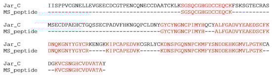 Alignment of the recombinant JarC peptides with the native JarC sequence. The predicted amino acid sequence of recombinant JarC was compared with the native JarC sequence (AAB30855.1) from the venom of Bothrops jararaca. The sequences were aligned with ClustalW (web.expasy.org), with identical residues to the first sequence highlighted in red.