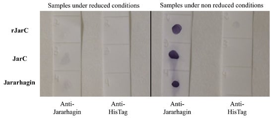 Dot blotting of native (JarC and Jararhagin) and recombinant proteins (rJarC) recognized by a polyclonal anti-jararhagin or anti-histidine antibody under reduced (10 µM Dithiothreitol—DTT) and non-reduced conditions.