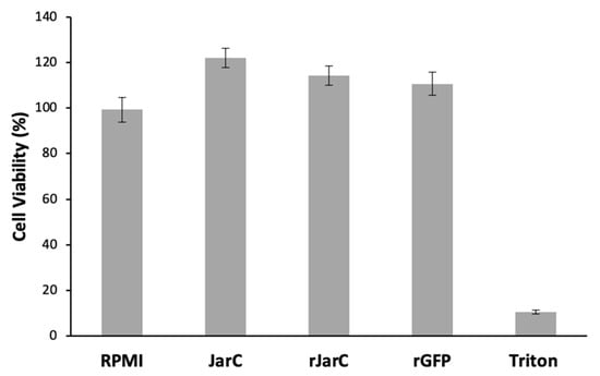 Viability of HUVECs treated with native JarC and rJarC. Cell viability was determined using the MTT assay. HUVECs were not treated (RPMI) or treated with native JarC; rJarC; or rGFP at concentrations of 1 µM or Triton X 100 1% for 24 h.