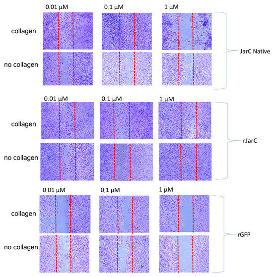 The assay to test cell movement in an empty field mimicking an in vitro model of wound healing was performed using CRL 1730 HUVEC cells as described in [,]. An amount of 1 × 106 CRL1730 HUVEC cells per well, diluted in RPMI supplemented with 10% FBS, was seeded into a 24-well culture plate that had been previously sensitized with collagen type I (50 µg/mL) or had not received any sensitization treatment. The cells were maintained in complete RPMI medium at 37 °C and 5% CO2 for 24 h to attach to the substrate. After this time, the cells were washed twice with PBS buffer, RPMI culture medium containing only the antibiotics was added, and a line was scraped into each well using a sterile tip (200 µL). Samples of JarC and rJarC were added to these wells at concentrations of 0.01 µM, 0.1 µM, and 1 µM, or RPMI medium. The recombinant EGFP protein was used as an unrelated recombinant protein control. After 24 h, cells were fixed and stained using the HEMA 3 Stain Set Protocol (Thermo Fisher Scientific, Waltman, MA, USA) according to the manufacturer’s recommendations and analyzed under an inverted microscope with phase contrast (LEICA). Images were captured in triplicate using a CCD camera attached to the microscope in 6 central fields for each sample. A representative field was selected to create the image. The presence of cells within the scratched area indicates whether the cell migration process has taken place.