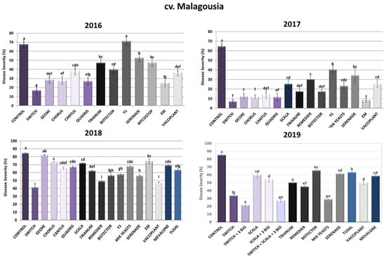 Disease severity of Aspergillus sour rot in grape berries of cv. Malagousia variety after PPP treatment of vines in the years 2016–2019. Statistical analysis was performed using one-way ANOVA followed by Tukey’s multiple-comparison post hoc test (p < 0.05). Letters above the graphs indicate differences between treatments.