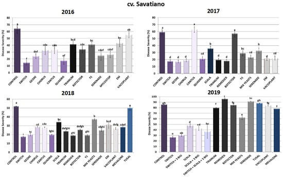 Disease severity of Aspergillus sour rot in grape berries of cv. Savatiano variety after PPP treatment of vines in the years 2016–2019. Statistical analysis was performed using one-way ANOVA followed by Tukey’s multiple-comparison post hoc test (p < 0.05). Letters above the graphs indicate differences between treatments.